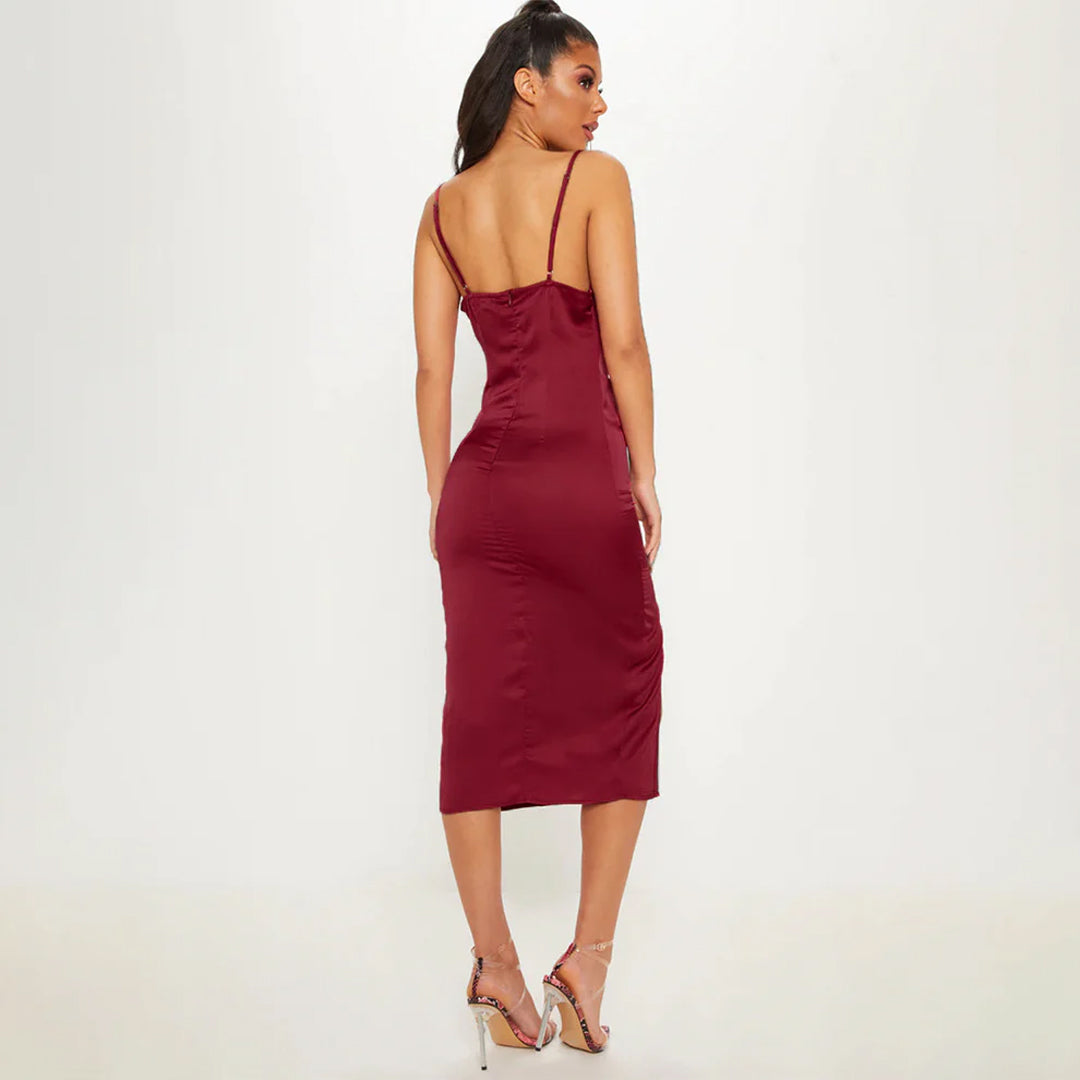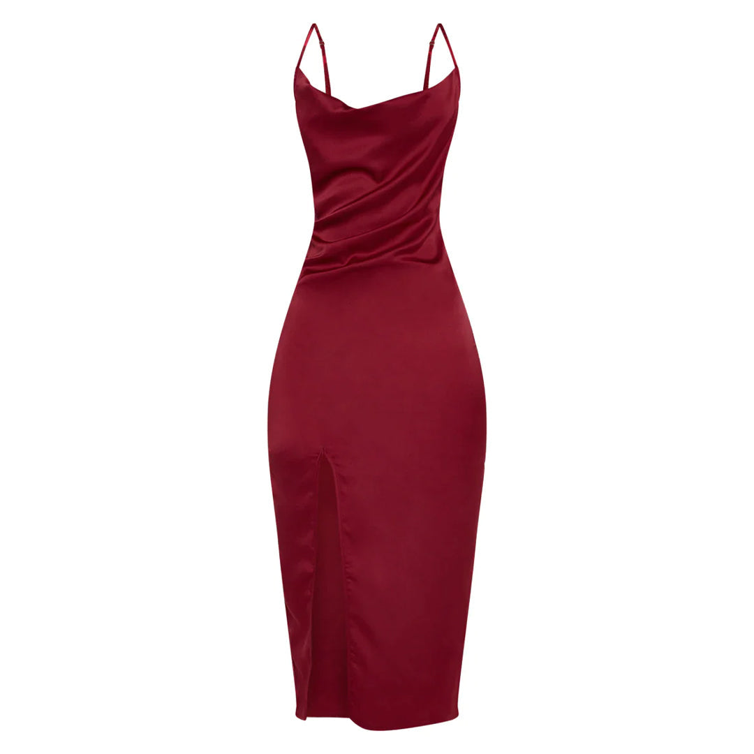 Get weekend ready in this must-have burgundy midi dress doll. Featuring a burgundy hue satin material with a cowl neckline and a midi length, we are obsessed with this dress style.