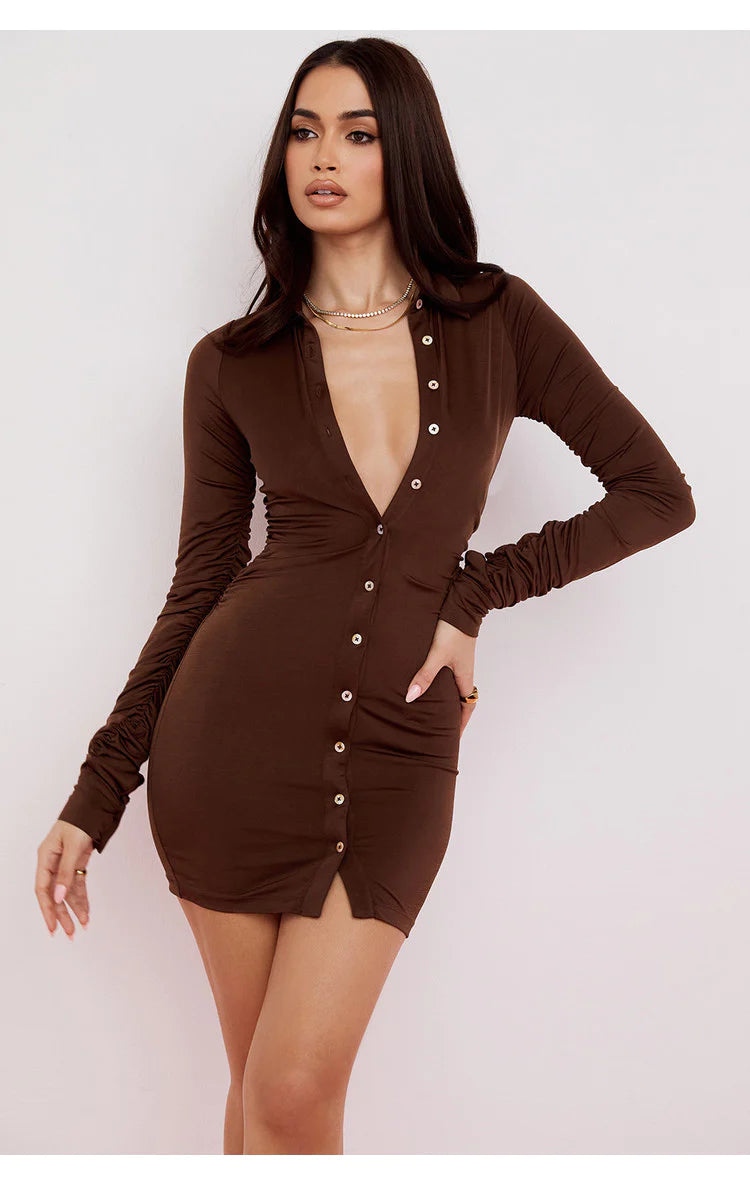 The foxy sheath dress is mini sheath dress with collar and buttons which gives it shirt like look and ruching at waist area makes this dress perfect for semi formal events or fashion formal.