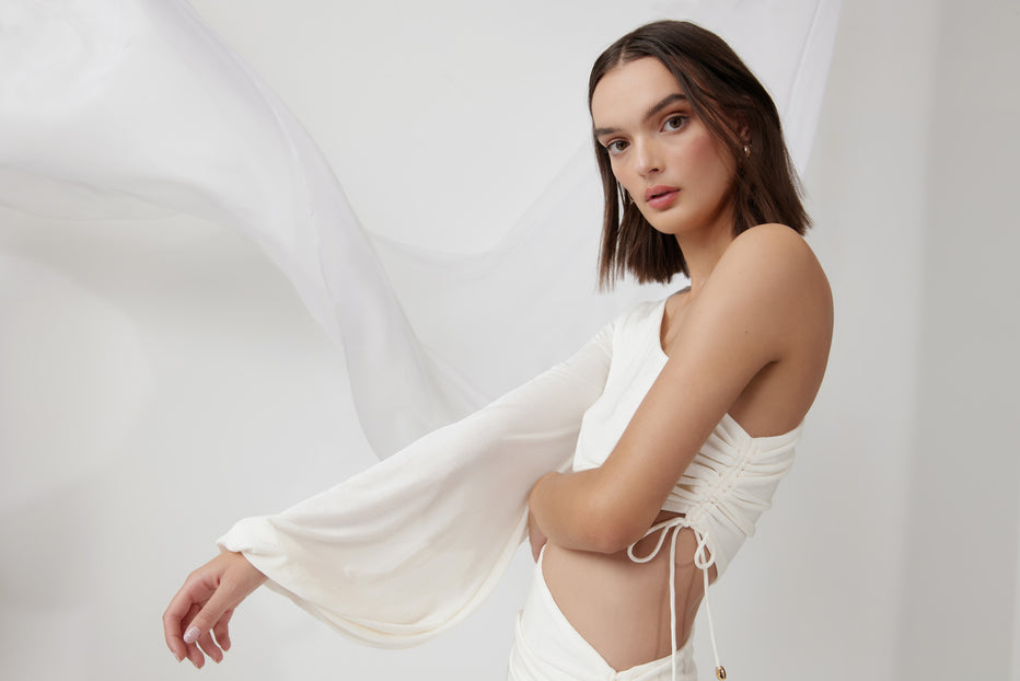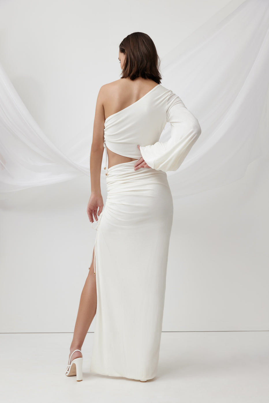 Asymmetric white maxi dress with cut-out, front slit and gathering at the sides with a bow detail.