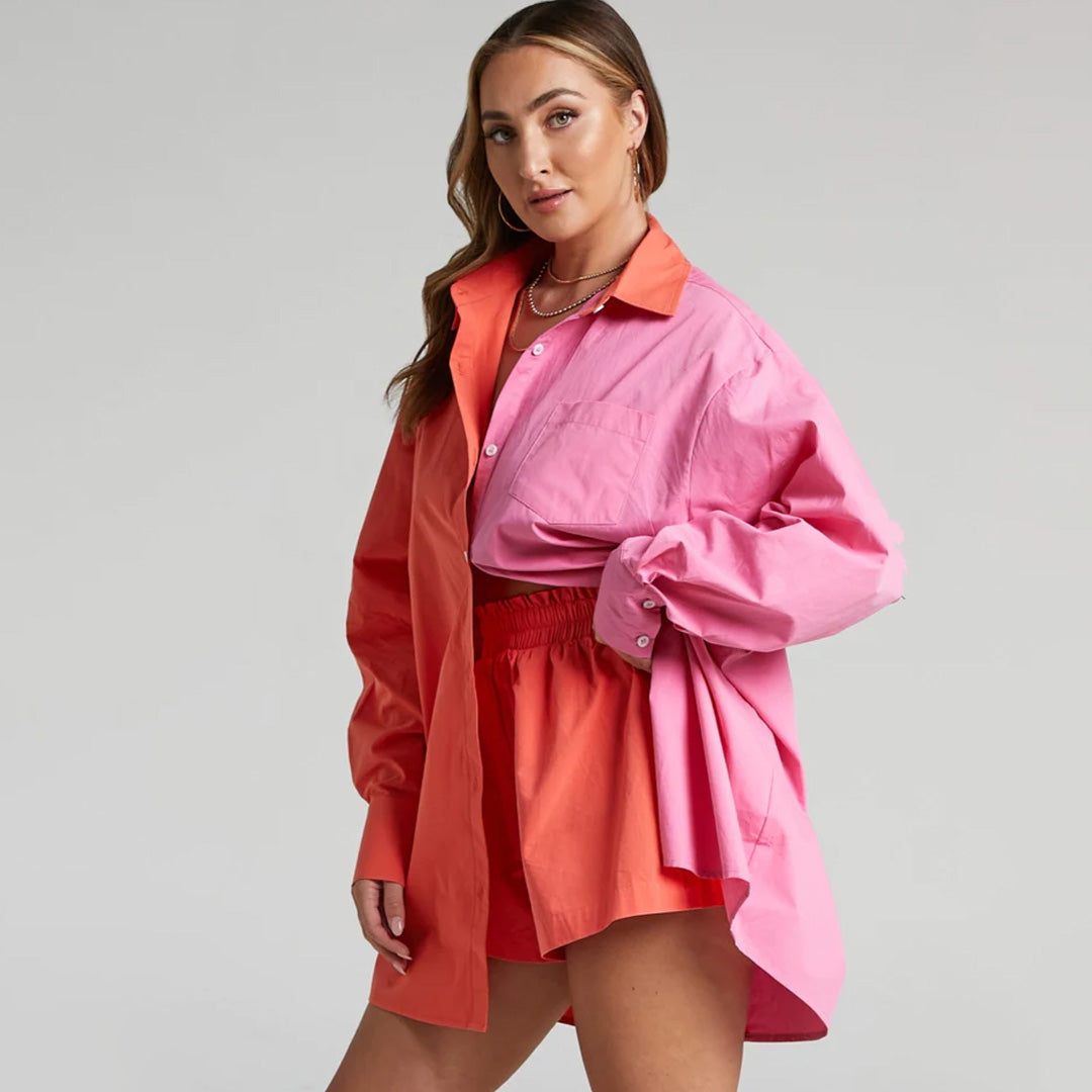 Unleash your fiery side with the Colour Block Oversized Button Up Shirt Set in Oxy Fire & Pink. This stunning red top is perfect for adding a pop of colour to any casual outfit, while its longline design and cotton material make it comfortable enough for all-day wear during summer weekend activities. With its classic collar and long sleeves, this shirt is versatile enough to be dressed up or down depending on the occasion