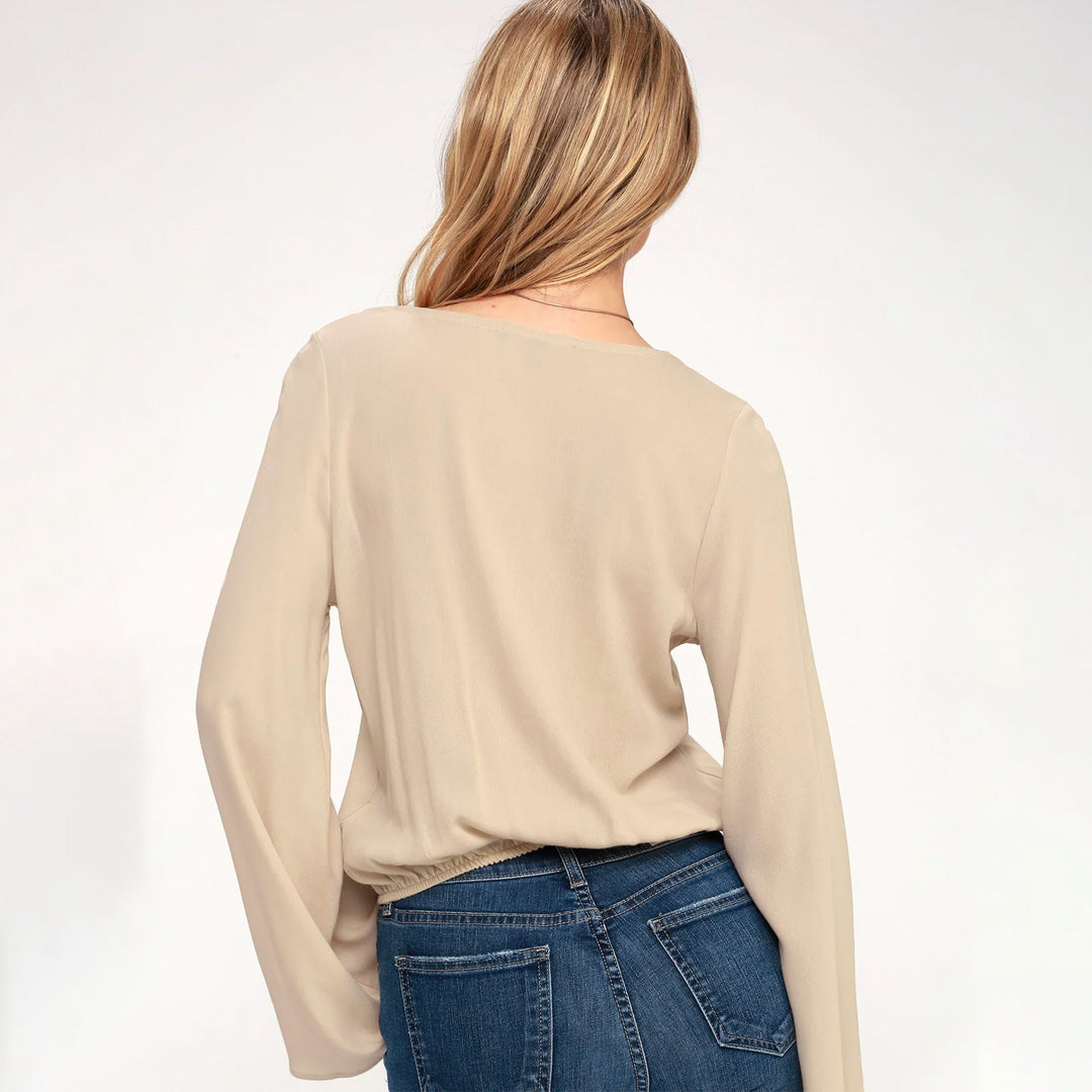 Lightweight woven fabric sweeps over the relaxed, surplice bodice into an elasticized hem. Long bell sleeves elevate the look.