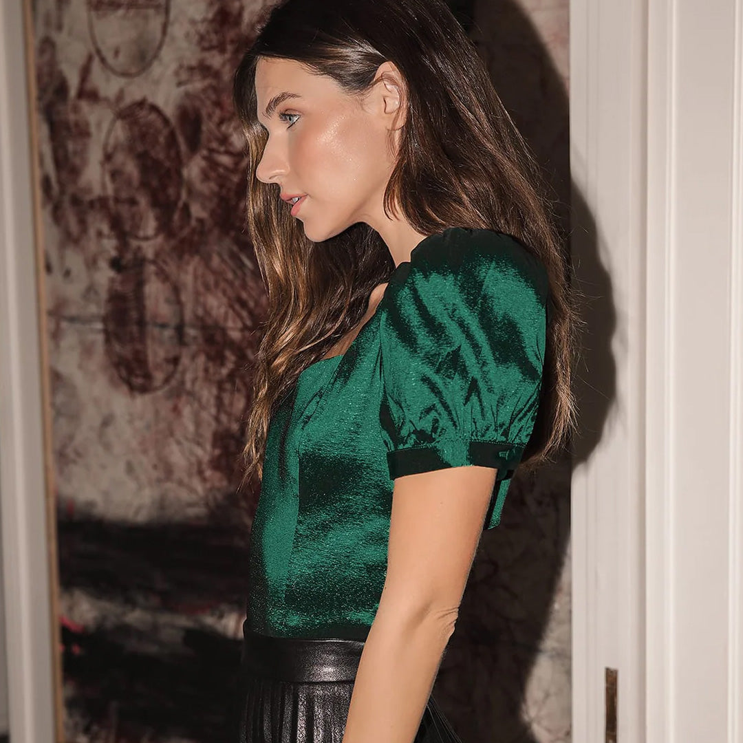 May I Present Emerald Green Puff Sleeve Top needs no introduction! This shiny, woven taffeta top is teeming with elegance thanks to its flirty sweetheart neckline, princess-seamed bodice, and short puff sleeves with buttoning cuffs.