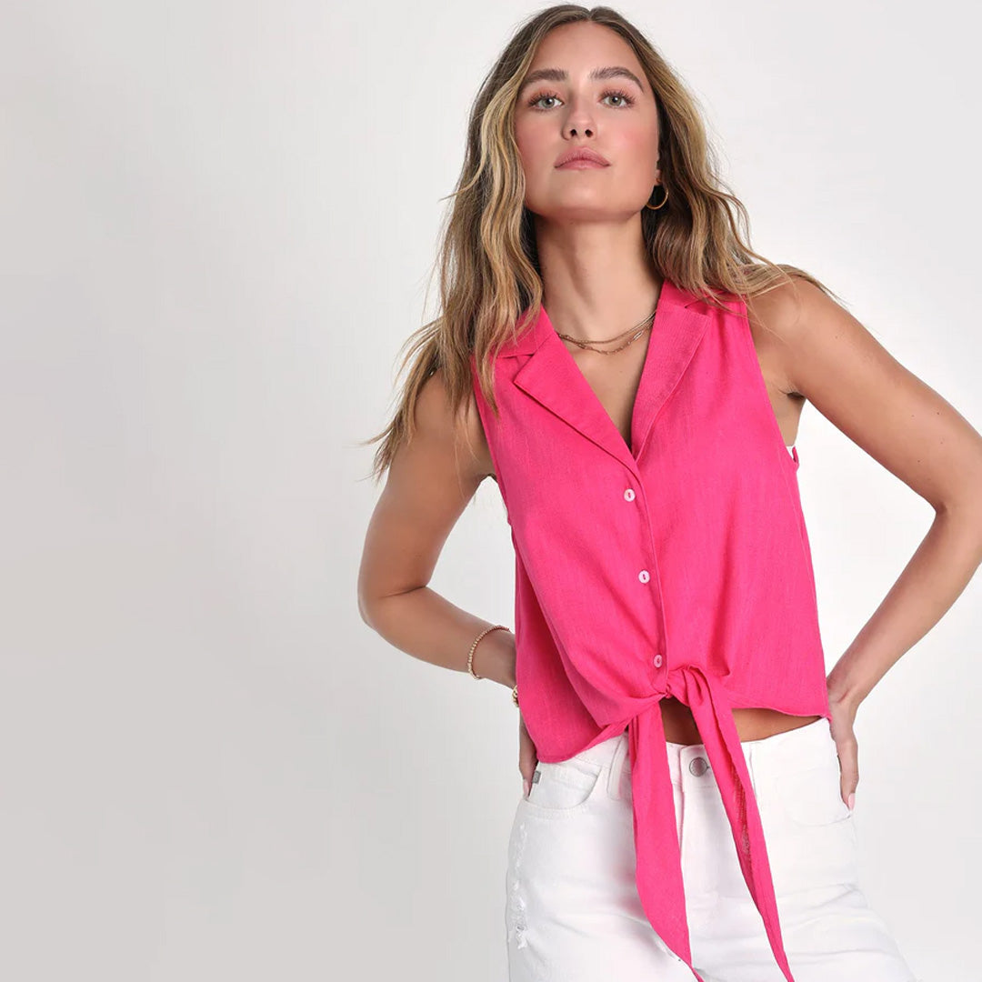 The Napa Valley Views Hot Pink Collared Button-Up Tie-Front Top pairs best with sweet sunsets and a glass in hand! Lightweight, linen-blend fabric shapes a collared neckline, atop a sleeveless bodice with a functional button placket at the front.