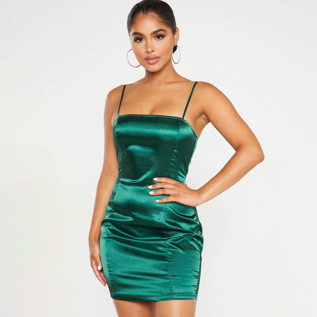 Have all eyes on you in this simple but chic dress. Featuring an emerald green satin material with a strappy design and a figure-hugging fit. Style this with sky-high heels and simple accessories to complete the look.