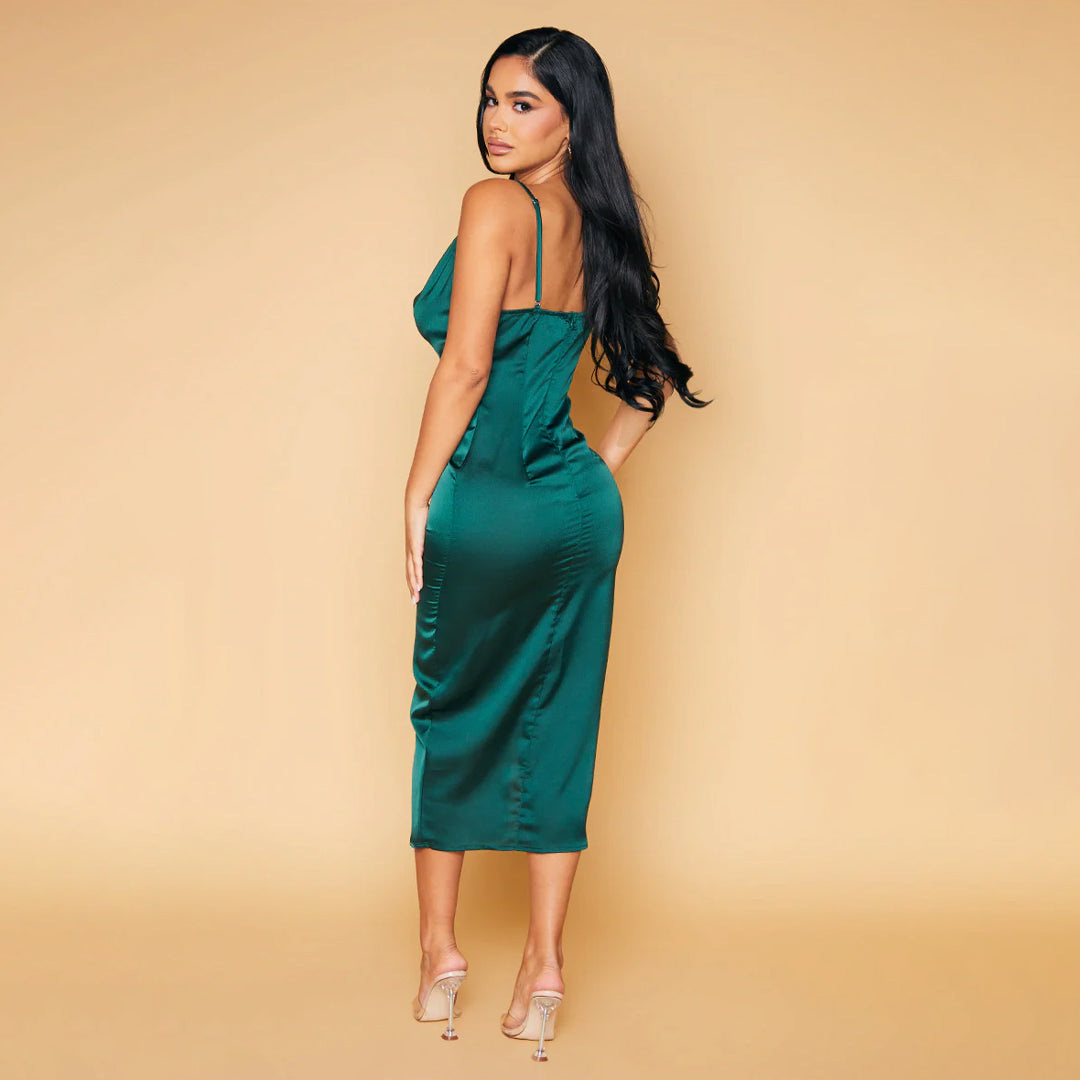 Get ready to look all kinds of glam in this dress. Featuring an emerald green satin material with a cowl neckline and a midi length. Just add heels and statement accessories for a look that is sure to turn heads doll.
