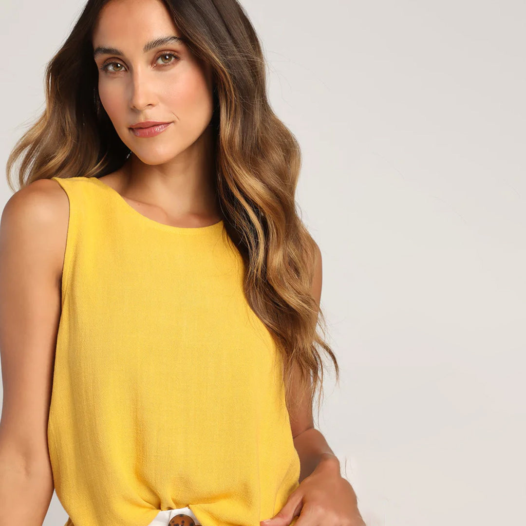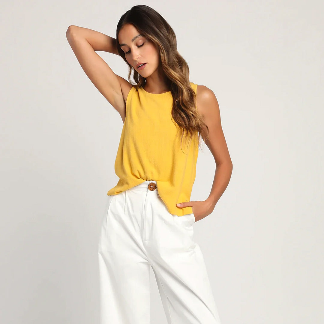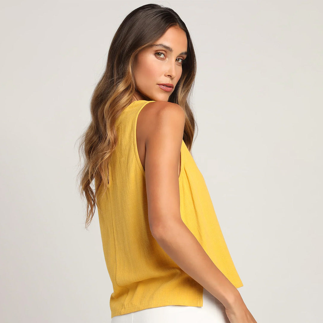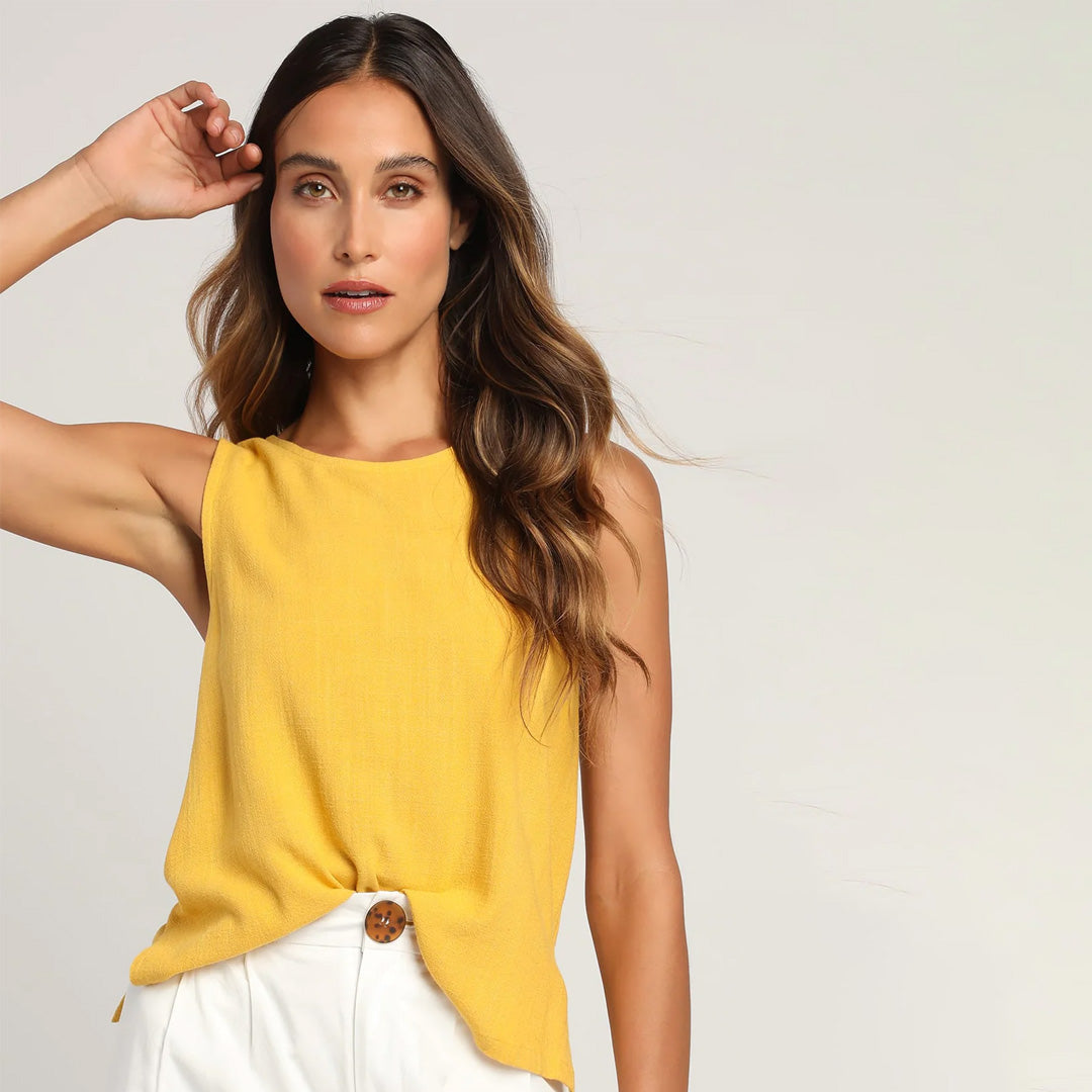 Total Refinery Mustard Yellow Linen Tank Top makes it so easy to put together a polished look! Lightweight woven linen-blend fabric creates this versatile top and its rounded neckline, sleeveless bodice, and slightly cropped hem with two notches at each side. Back keyhole has a buttoning closure.