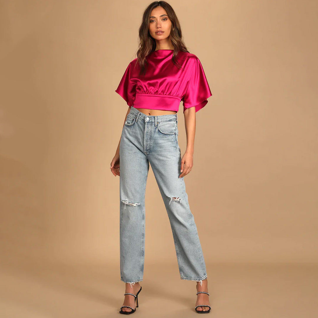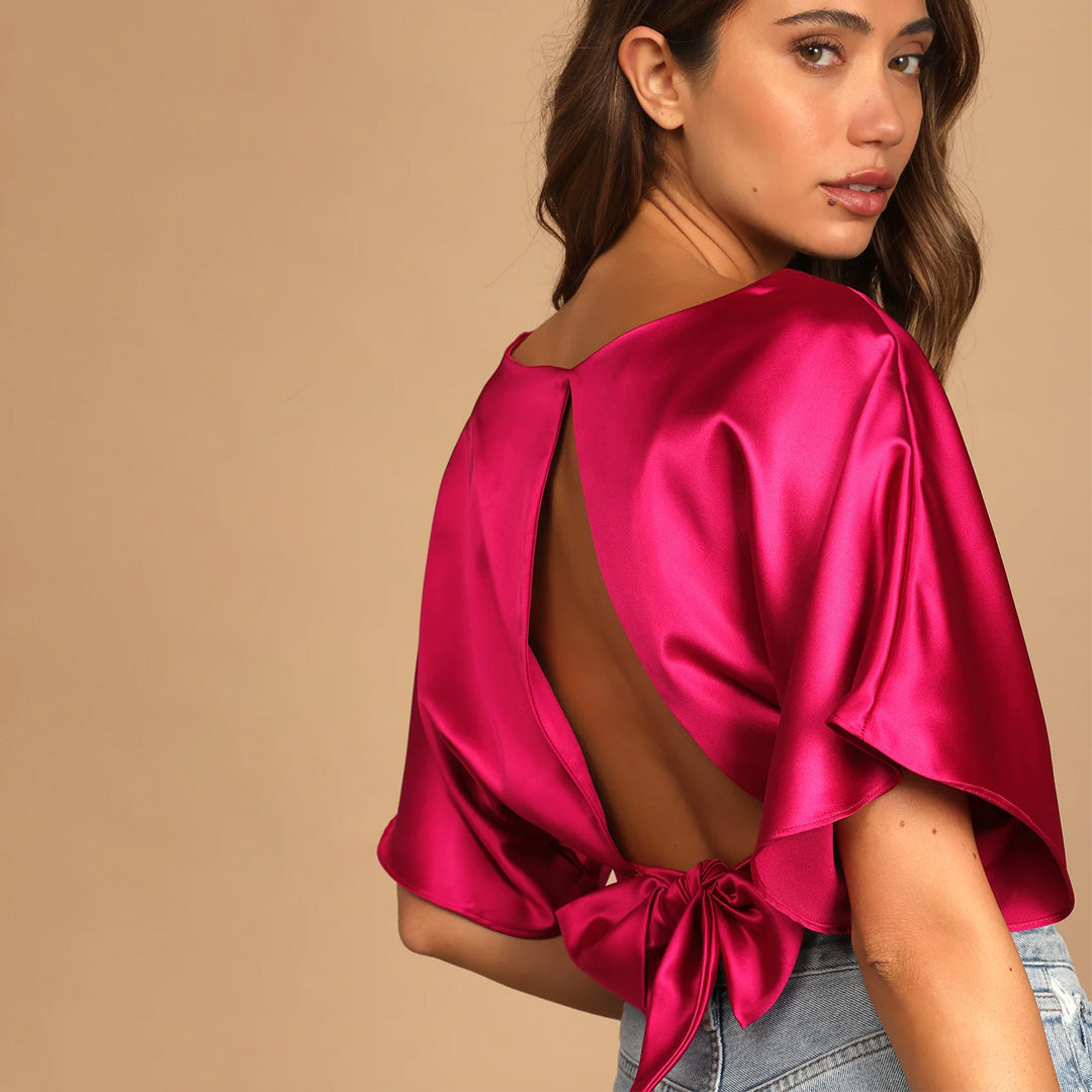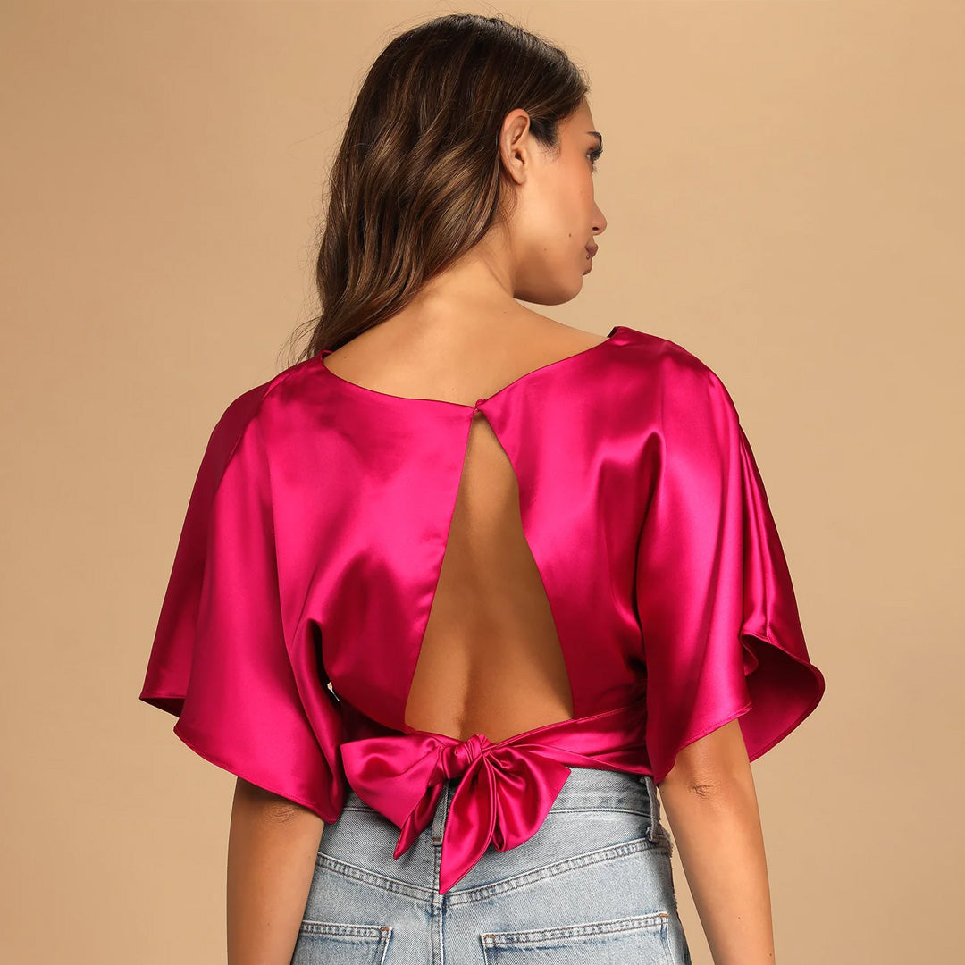 Flirty yet classic, the Upgrade to Chic Hot Pink Satin Tie-Back Crop Top is the best of both worlds! Sleek woven satin shapes this top that has a rounded neckline and flowy short dolman sleeves.