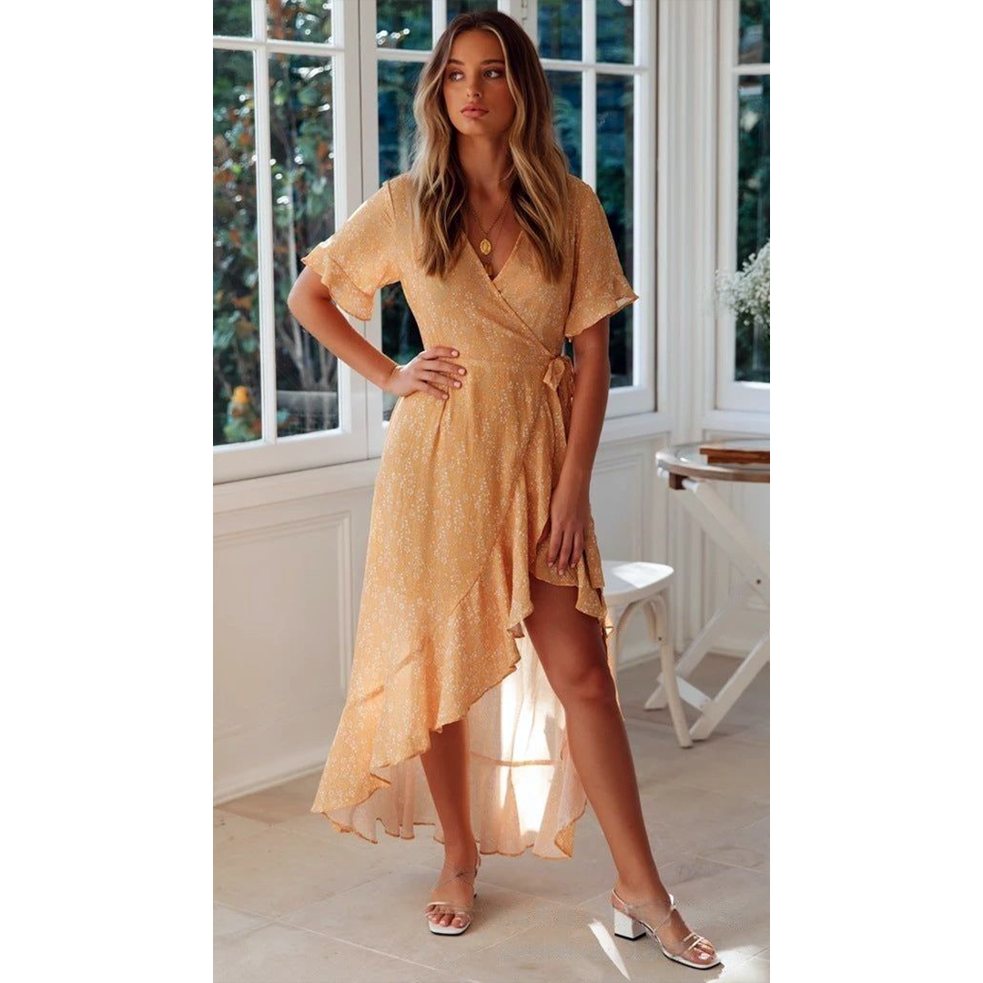 Women's New Fashion Retro Print Tie Short-sleeved Sexy Midi Dress